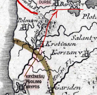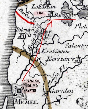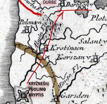 !!! Štai nuo čia ir prasideda Lietuvos (ir ne tik) mokesčių mokėtojų išlaikomų istorikų loginės klaidos! Pagal juos iš Klaipėdos, liepos mėn. pradžioje, link Georgenburgo/JURBARKO iškeliavę kryžnešiai staiga pasuką į erdvę dabartinėje Latvijoje. Kuri jau buvo pilnai valdoma kryžiuočių. Atsiverskite tiesiog žemėlapį ir pažiūrėkite kur randasi Jurbarkas ir kur Latvijos Durbė. Kas per loginė klaida! O dabar pažiūrėkite kur randasi Darbėnai ir kaip galima nuvykti iš Jurbarko iki Durbės Latvijoje ir Darbėnų Žemaitijoje upėmis arba paupiais. Priminsiu vienintelė laisva tuo metu buvo likusi Žemaitija. Gi žemaičiai pagrinde kovojo dėl Klaipėdos susigražinimo, o kryžnešiai dėl žemaičių galutinio pavergimo. Tad tikėtina kad žemaičiai apgaulingais manevrais nukreipė kryžiuočius link Jurbarko prie Nemuno upės, o patys buvo susiruošę staigiu puolimu užimti Klaipėdą, tokiu būdu apsupdami pagrindines kryžnešių pajėgas, apsuptyje jas pilnai sunaikindami. Būdamas popiežiaus kryžnešių pavaldiniu Mindaugas galimai nutekino žinią apie visos Žemaitijos karių susitelkimą bei jų planą užimti Klaipėda/Memelburgą. Todėl, suvokdamos karinę apgaulę bei grėsmę, katalikų rinktinės pajėgos buvo priverstos staigiu manevru judėti link žemaičių karių susitelkimo vietos, taip išvengdami rimtesnių spąstų nei kad 1260 m. Liepos 13 d. sekęs mūšis.!!!