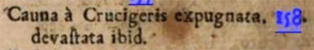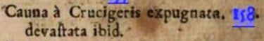 Aukštiesiems pareigūnams įsakius ir leidus, brolis Henrikas iš Šioningeno [išvyko] išžvalgyti ir nustatyti Kauno pilies ir mūrų storumo, gilumo ir aukštumo, ir pastatyti mašinų , sienodaužių ir t. t. bei pranešti tų duomenų magistrui, nes ateinančią žiemą manė pulti Kauną <....> kurio mūrą krikščionys buvo jau taip suknežinę, kad jis nuvirto drauge su stabmeldžiais. Krikščionys supuolę žeidžia juos ir žudo , ir šitaip užėmė priešpilį, o stabmeldžiai buvo priversti šliaužti [atgal] į pilį.